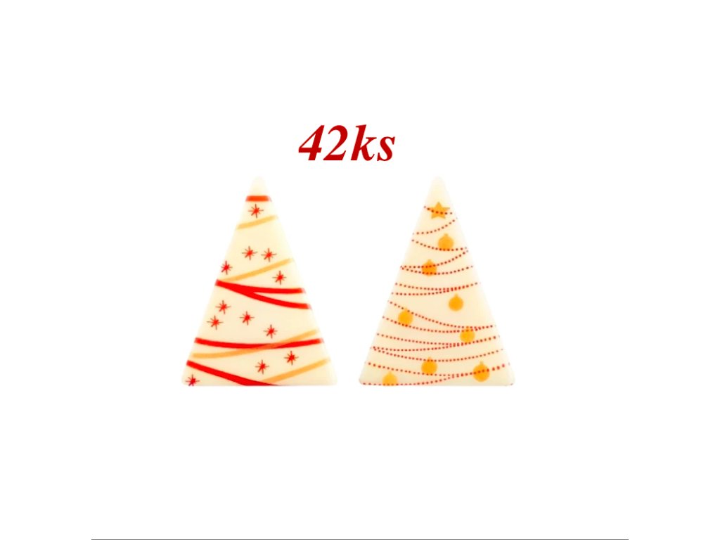 Čokoládová ozdoba v tvare vianočných stromčekov (trojuholníkov) v červených farbách s rozmerom 34 x 47 mm, vyrobená z kvalitnej bielej čokolády.