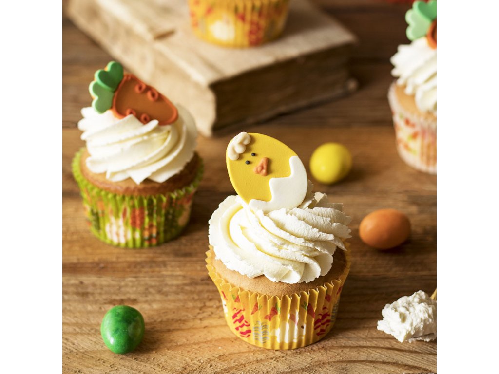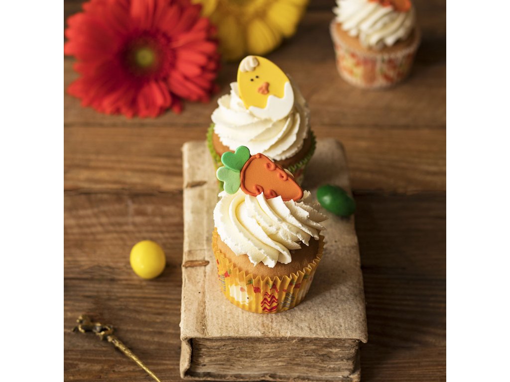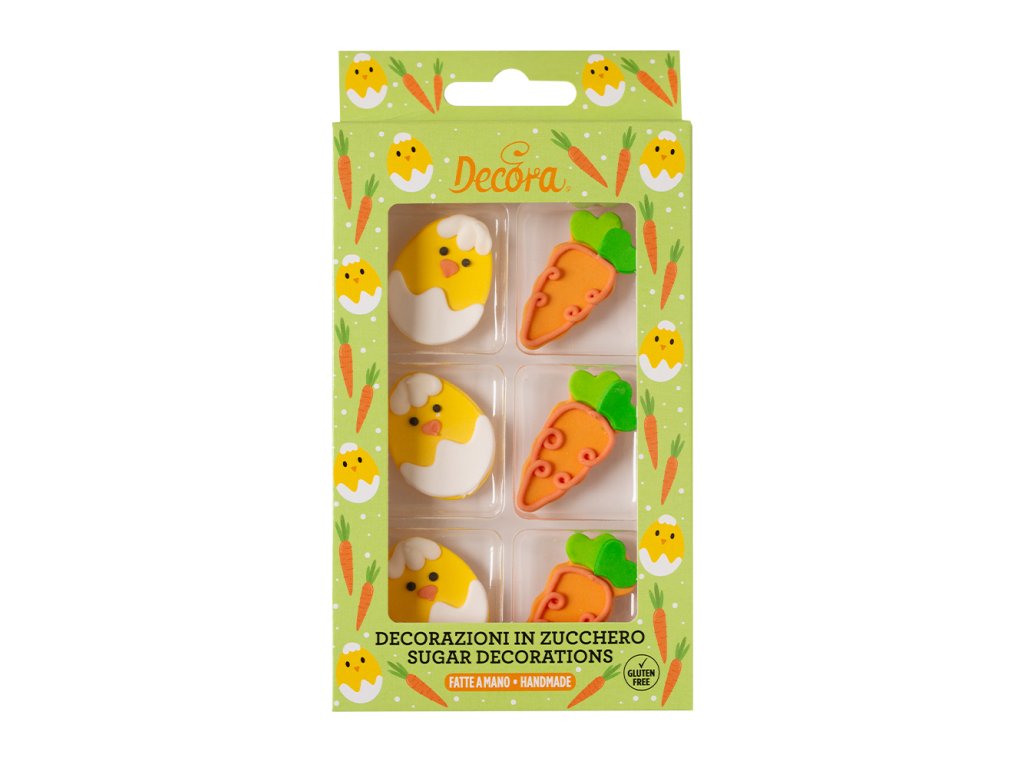 Cukrová dekorácia kuriatka a mrkvy. Ručne vyrobené s prírodnými extrahovanými farbivami.