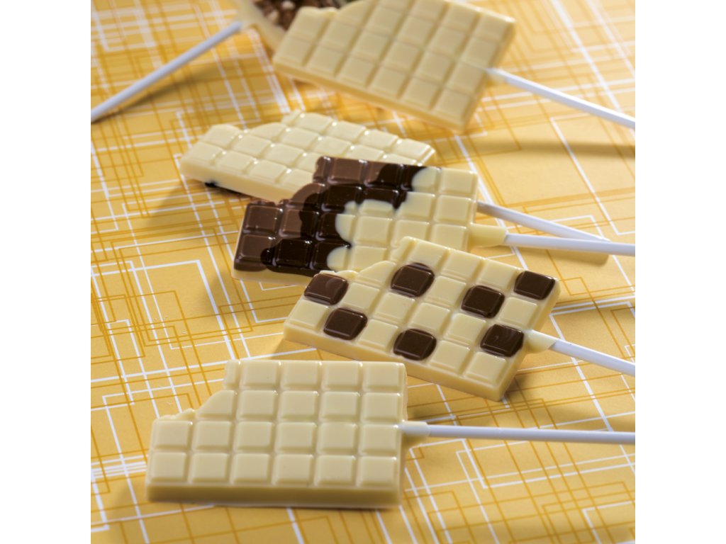 Tepelne tvarovaná plastová forma na lízatká s textúrou tabličky čokolády.