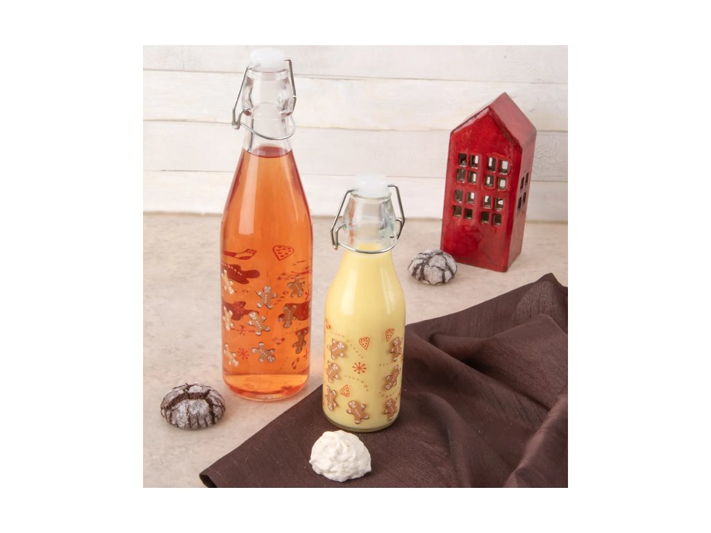Fľaša s dekorom na slivovicu, vaječný likér, sirup, šťavu a iné nápoje.