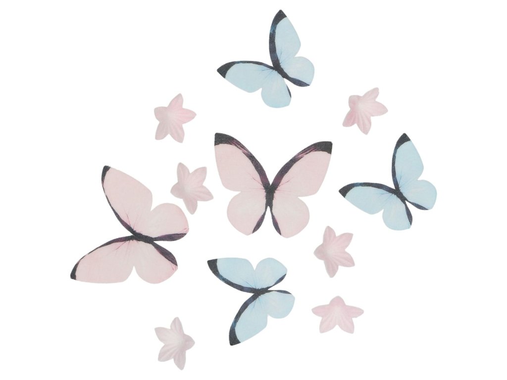 Tieto krásne jedlé oblátkové dekorácie kombinujú roztomilé malé kvietky a veselé motýle v jemných ružových a modrých farbách.