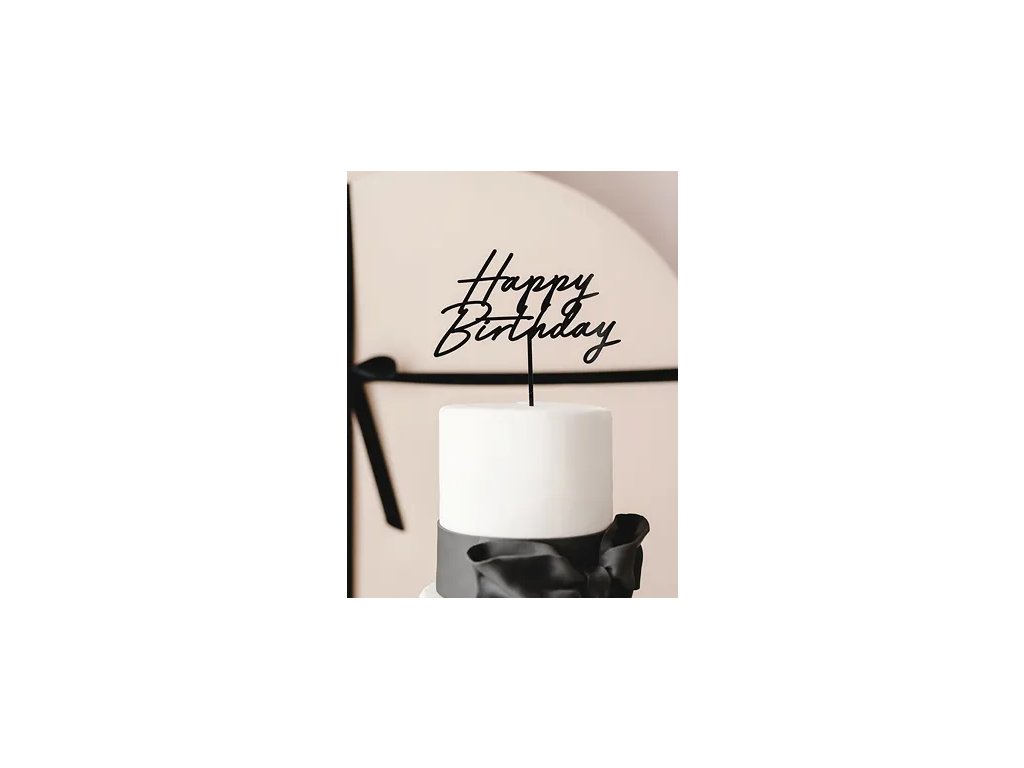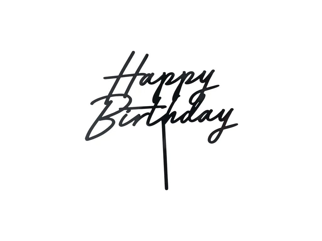 Akrylová zápich na tortu „Happy Birthday“ v čiernej farbe.
